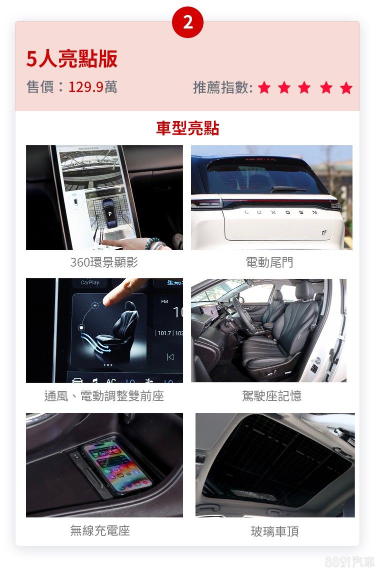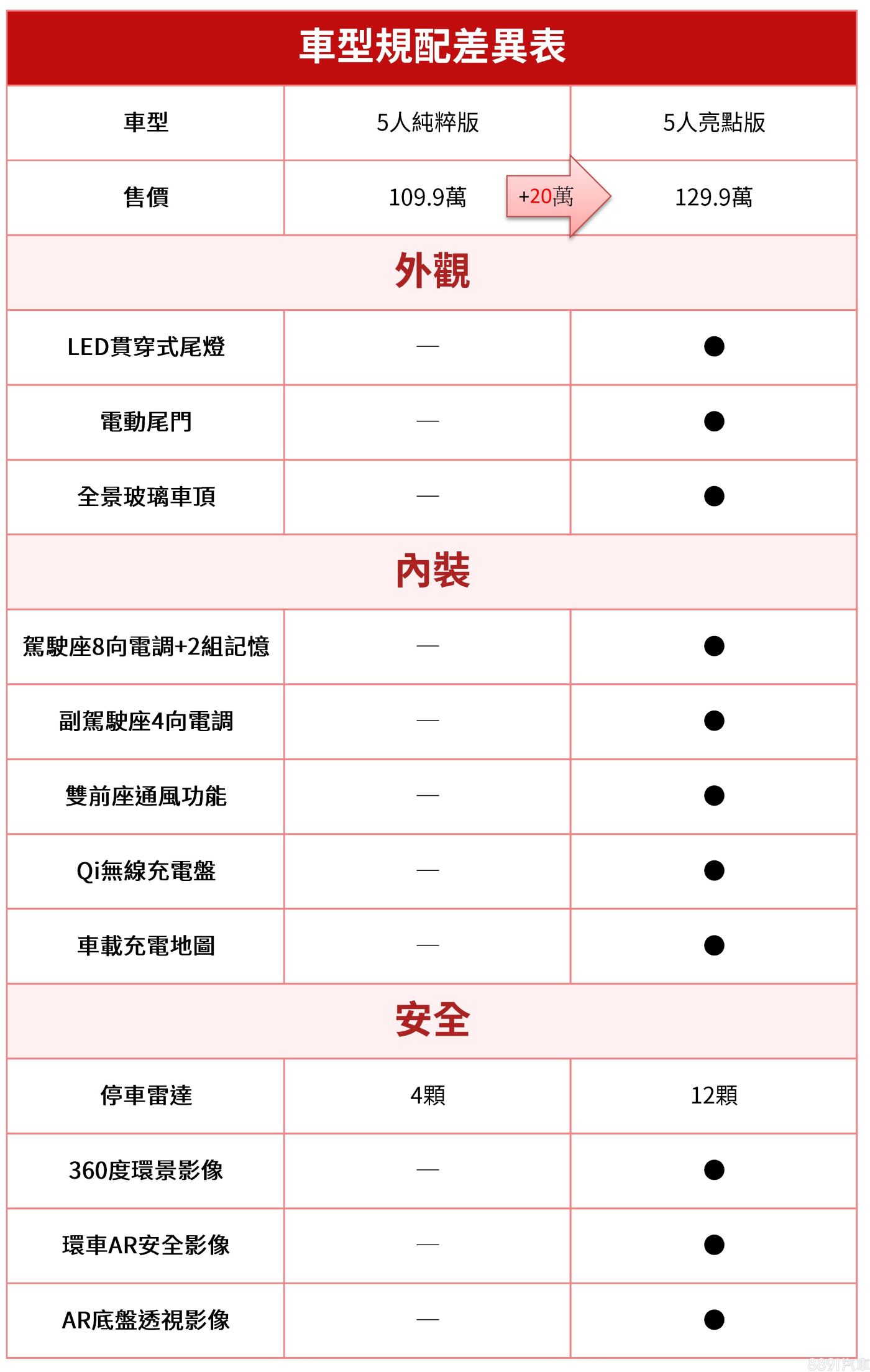 進到第二階的5人亮點版,雖然定價多了20萬,但獲得的配備不少,包含電動尾門、全景式玻璃車頂、雙前座通風/電動調整、駕駛座記憶、360環景、AR底盤透視、手機無線充電,都是實用性高且能增添舒適度、使用質感的配備,以20萬的價值來說,個人覺得「物超所值」,因此最為推薦!