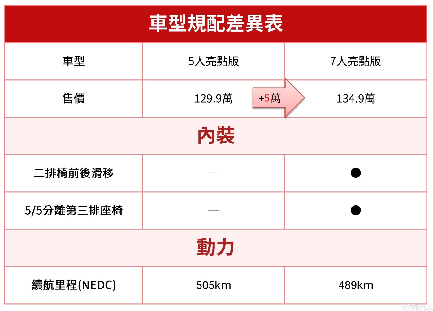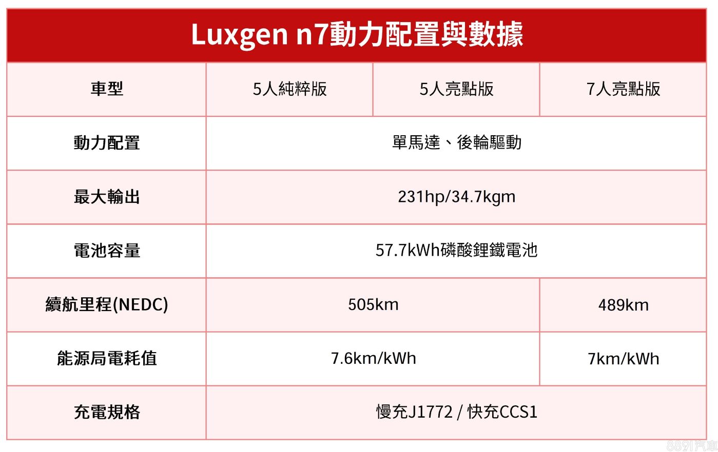三車型雖然動力配置一樣,搭載的電池容量也相同,但續航力略有差異,5人座版本最大續航里程可達505km,而車重多了40kg的7人座版本,續航里程稍降至489km,兩者差距16km,大概是雙北通勤者單趟移動的距離,另外值得一提的是,n7採用NEDC測試標準,而非更貼近日常使用情境的WLTP,因此官方數據參考就好,實際續航里程還得再打折扣。