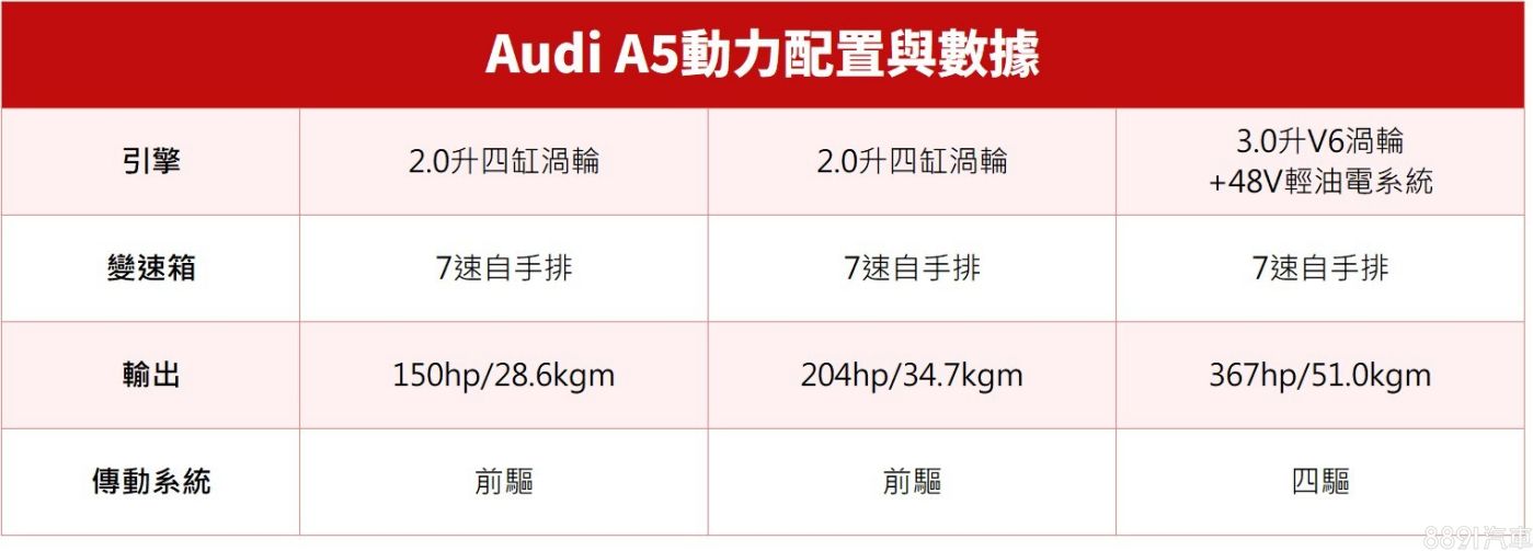 除了S5之外,其他車型皆為前輪驅動,quattro作為Audi品牌靈魂之一,卻無法在一般車型上與之搭配,是A5產品編成的小缺點,也讓想入手四驅系統的消費者門檻瞬間拉高,如果可以比照過往A5 Sportback,安插一個300萬出頭、配備四驅的2.0升版本供選擇,個人認為產品打擊陣線會更全面,在雙B無相應產品情況下,或許還能再多點市場份額。