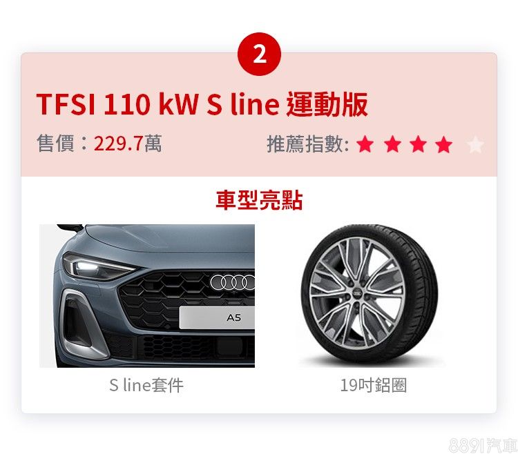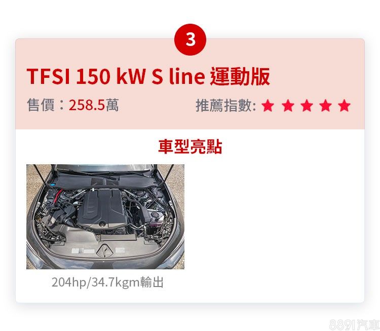 在Audi A5四款車型中,TFSI 150 kW S line運動版雖不是最便宜,但擁有S line運動化外觀、全套科技配備與舒適便利機能,更重要的是,204hp動力較為充沛,無論日常代步或高速巡航都能游刃有餘,較能體現豪華品牌價值所在。相較其他版本,入門配備略少,S line 110kW動力較低,至於S5相信也非普羅買家選擇範圍內,因此150 kW S line就是最值得主推的黃金中階選擇。
