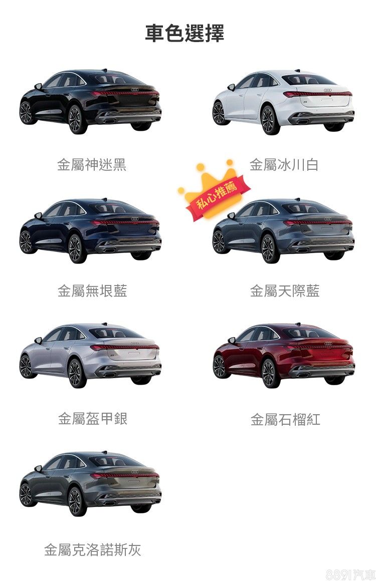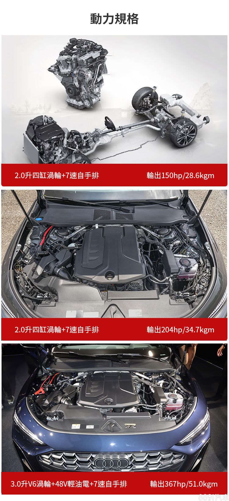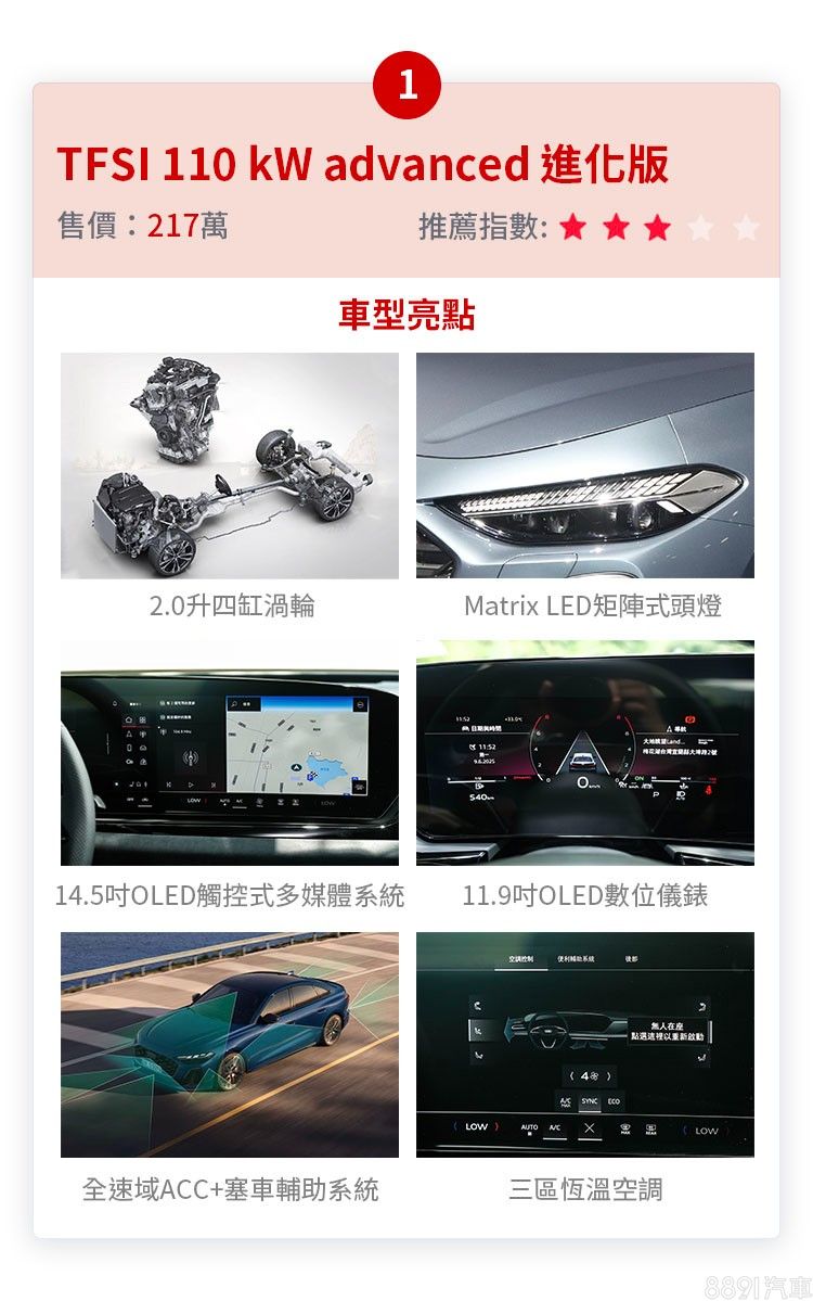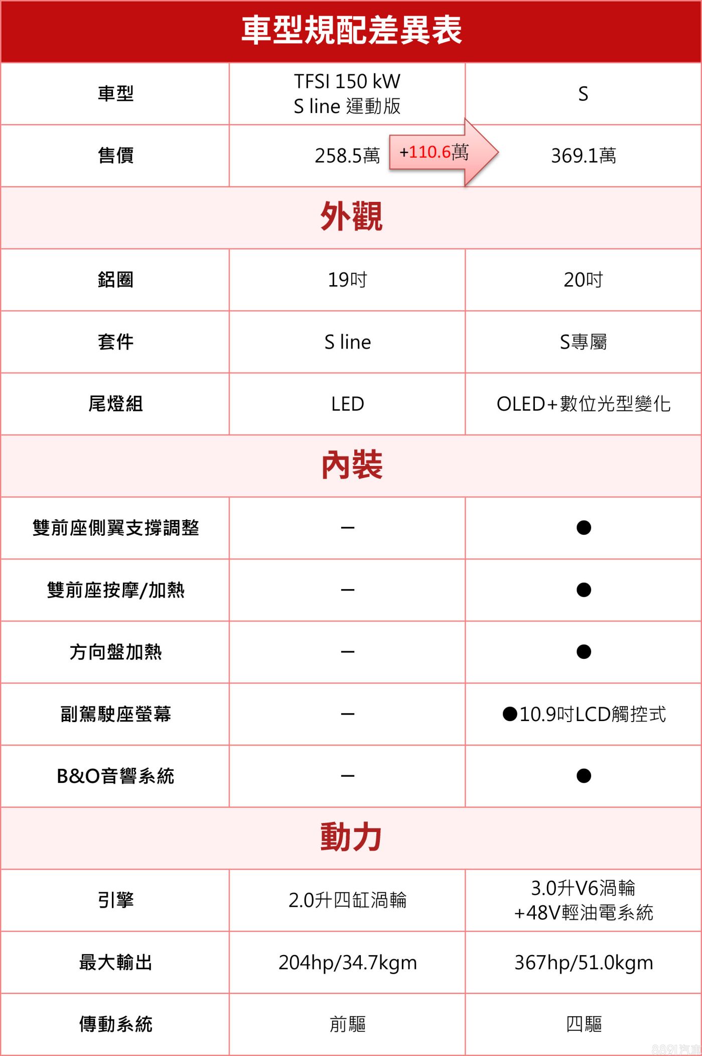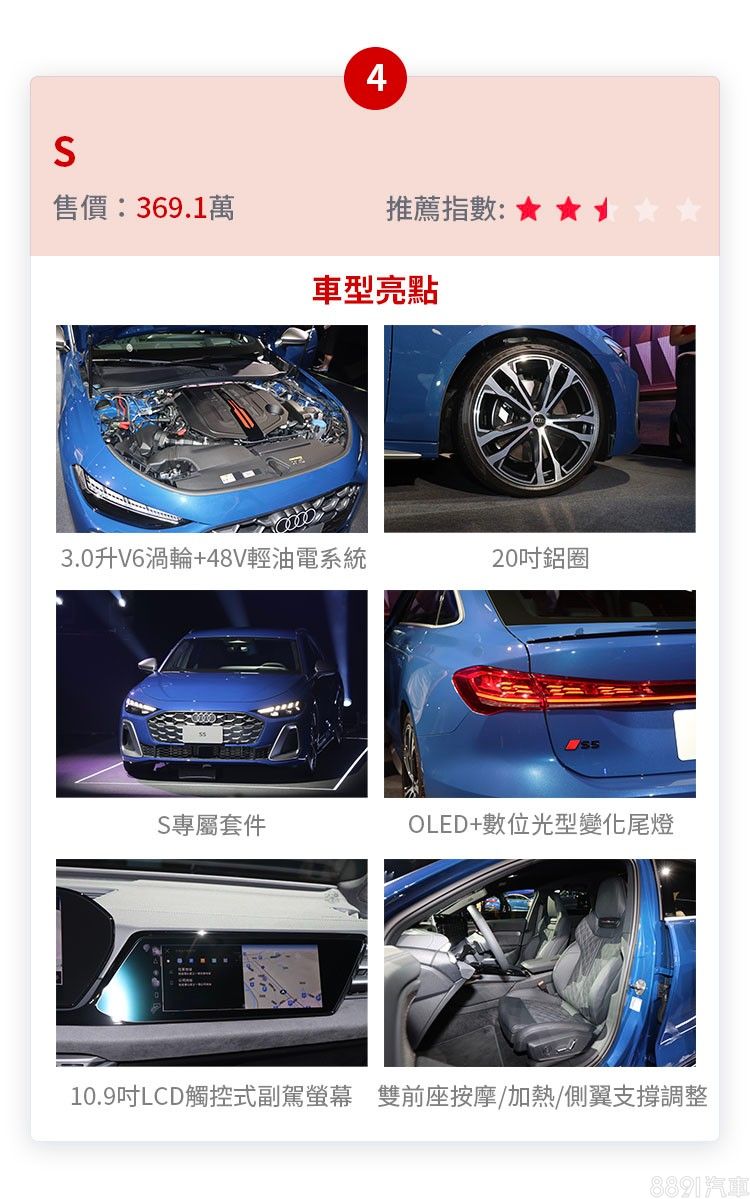 搭載V6引擎與quattro四驅系統,動力表現卓越,配備方面除了有專屬外觀、高階頭燈外,內裝更升級雙前座按摩、加熱與B&O音響,並且標配副駕螢幕。但售價落入高端區間,偏向小眾性能買家需求。