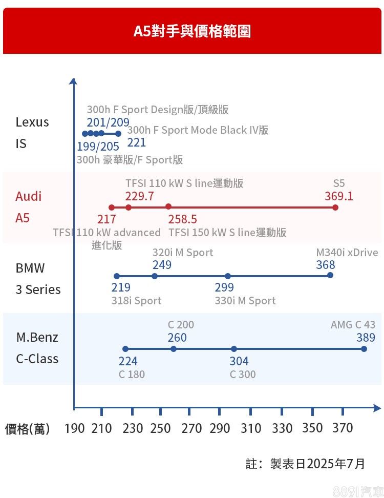在Audi A5全車系中,TFSI 150 kW S line是主力銷售版本,放眼同級對手BMW 320i M Sport(249萬)與賓士C 200(260萬),A5雖然在價格與動力上不見優勢,但憑藉最新世代設計語彙與科技配備整合度,相信能在使用體驗與產品新鮮感上明顯勝出。同時,入門的TFSI 110 kW進化版則對應日系對手,Lexus IS產品世代為同級最老,雖A5入門動力僅150hp,但內外世代差距感受,比起對上雙B更為明顯,在200萬出頭級距成功塑造高科技、高質感形象,具備充分吸引力。