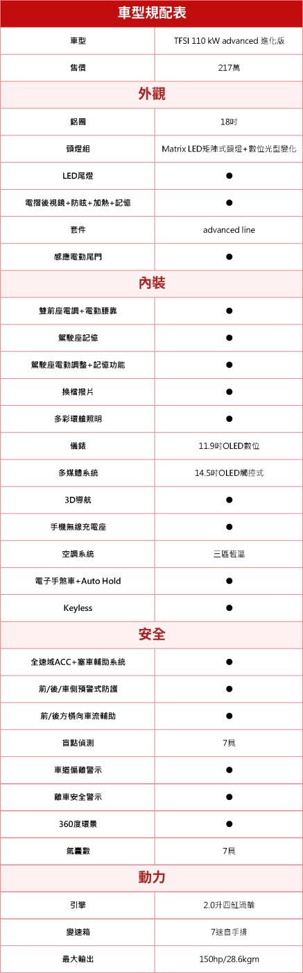 從產品編成來看,TFSI 150 kW S line運動版以258.5萬元提供完整科技配備、204hp強化輸出、S line運動化設計,是整體均衡性最佳的版本。雖然沒有quattro,但以輸出表現來說已足敷日常駕馭,可以給出隨傳隨到的推力,顏質、配備、動力全到齊,我認為這才符合普羅買家對豪華車的期待。