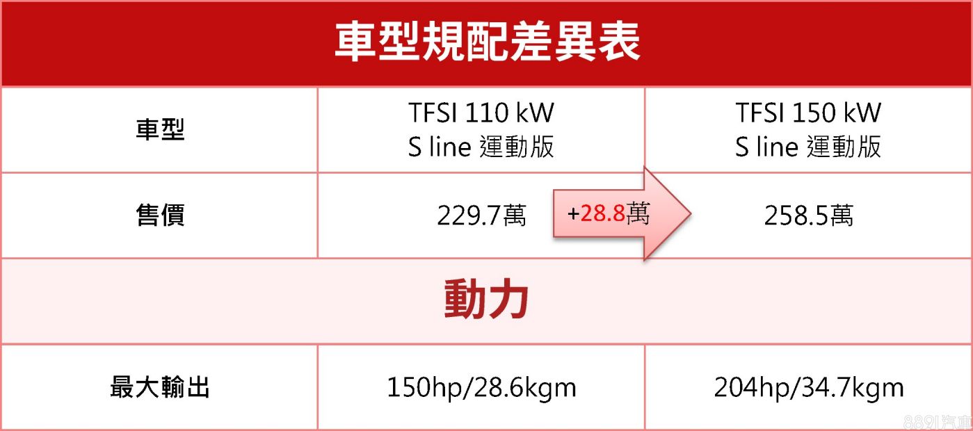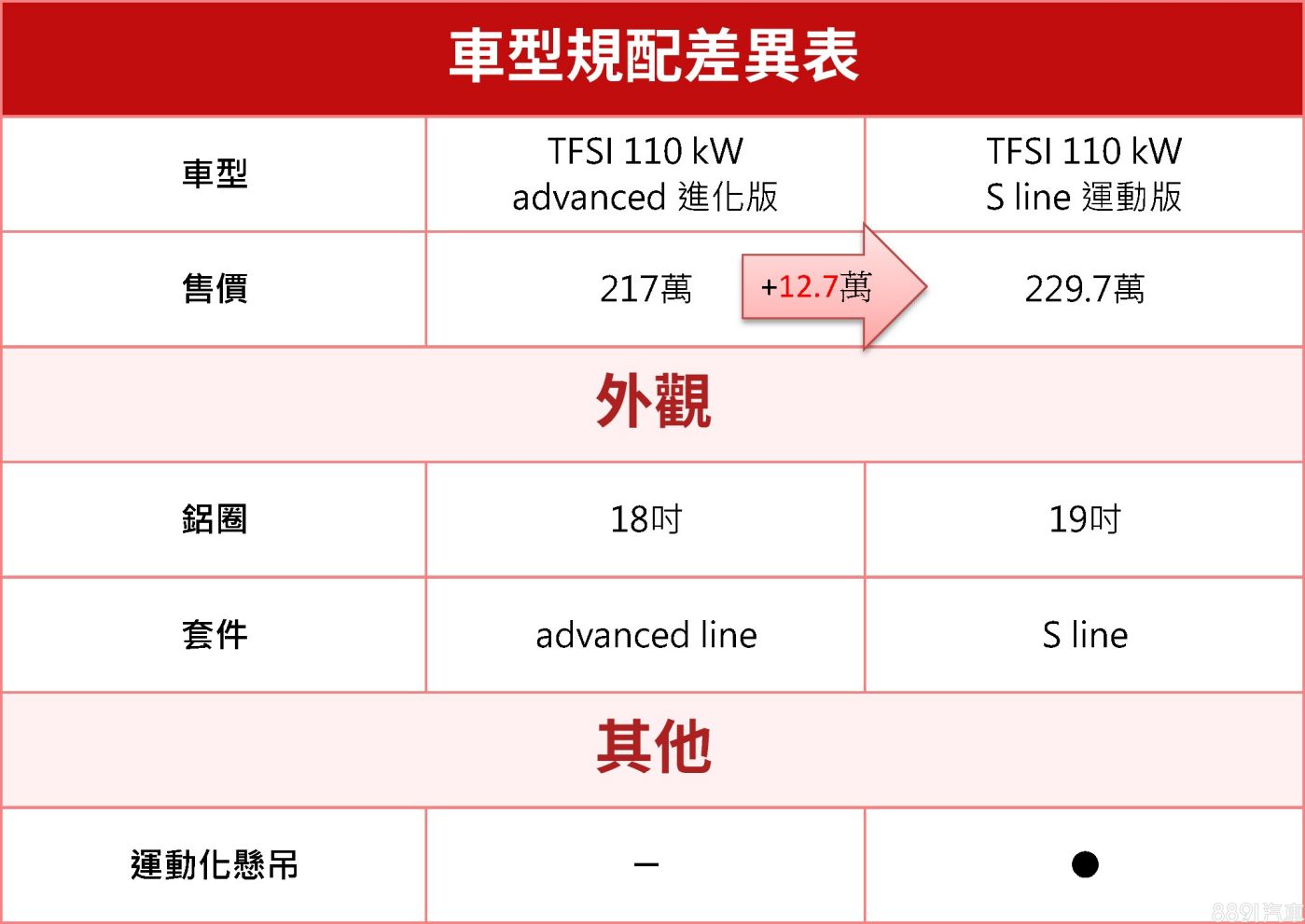 追加12.7萬升級S line套件與運動化懸吊、19吋鋁圈,視覺跑格感大幅提升,配備維持與進化版相同,適合重視造型但仍需顧慮預算的買家。但我誠心問一句,外型這麼殺的Audi,配150hp動力夠看嗎?