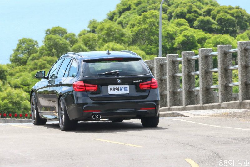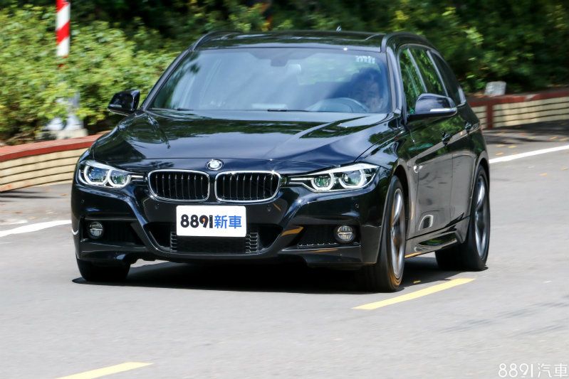 到了蜿蜒道路間,得以讓3系列一展操控長才,第一印象便是即時精準的轉向反應,車輛皆能了解駕駛下達的指令,依循心中所想的路徑前進,而過彎時產生的側傾並不令人感到慌張,車身穩定漸進的動態不難掌握,加上試駕車型的後輪尺碼達255/40R18,要將它開快並不難,而DSC系統可分兩階段關閉,給予駕駛的自主性頗高,當車輛瀕臨界線時,介入時機與過程並不會過於突兀,對自身技術有信心的駕駛可以玩得相當開心。由於這部320i Touring選配M套件,因此圈胎規格由標準的225/55R17升級為前225/45R18、後255/40R18,配胎採用普利司通S001失壓續跑胎, 應付184hp/27.5kgm動力輕鬆自在。