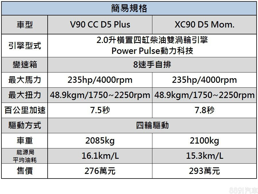 我們試駕的V90 Cross Country,另升級Polestar動力提升套件(選配價54705元),使得動力由原本235hp/4000rpm、48.9kgm/1750~2250rpm,略增至240hp/4000rpm、51.0kgm/1500~2500rpm,馬力與扭力小幅上漲,扭力輸出平原也更廣,其他動力規格兩車並無太大差異,均採用8速手自排與四輪驅動系統。